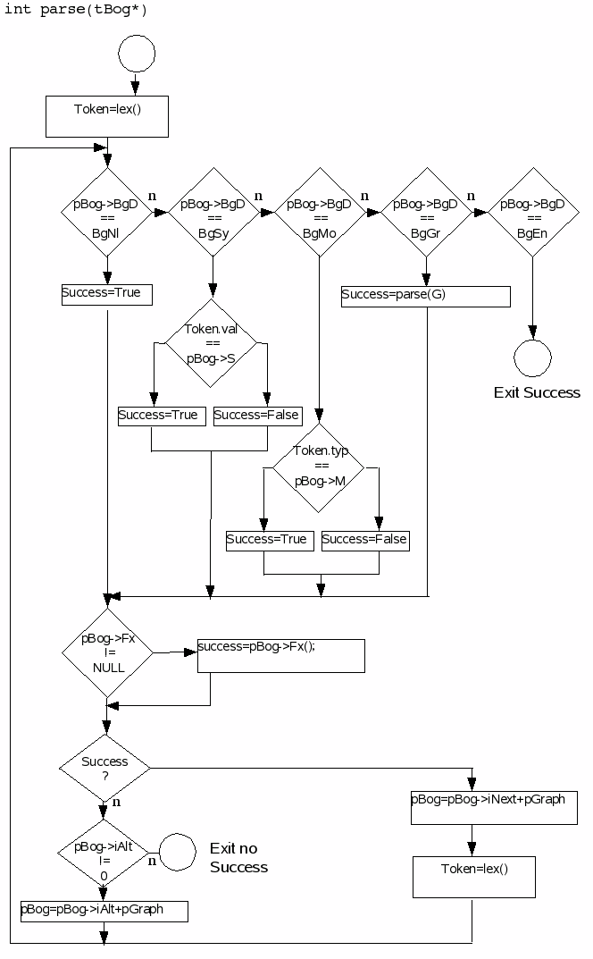 Die Funktion parse ist das Kernstück des Parsers. Sie wird aufgerufen mit einem Graphen als Parameter. Der Start des Parsers erfolgt mit dem Aufruf pars(gProg);. Immer wenn ein Bogen mit einem Metasymbol (BgGr) bewertet ist, erfolgt ein rekursiver Aufruf dieser Funktion pars mit jeweils dem angegebenen Graphen als Parameter. Der Aufrufstack von C ist hier etwas versteckt gewissermaßen der Analysekeller des Kellerautomaten. Der zu parsende Quelltext wird morphemweise vom Lexer gelesen. Jeder Aufruf von lex liefert jeweils ein Morphem.