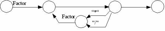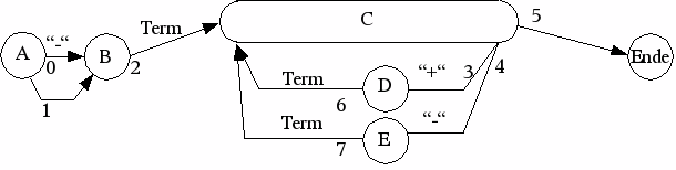 Nicht Terminales Symbol oder Graph, der Bogen ist mit einem Metasymbol bewertet (Programm, Block, Statement, Expression, Term, Factor, Condition). In der Bogenbeschreibung wird die Adresse eines Graphen angegeben.
