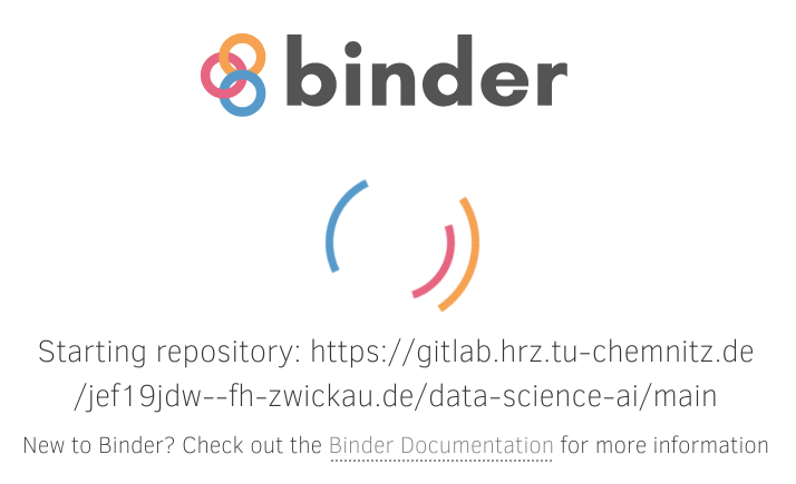 Starting the Binder session may take some seconds. Keep in mind that mybinder.org is a free service provided by volunteers and supported by donators. Don’t overuse it to keep it free and available to everybody. Don’t run complex computations like neural network training on Binder.